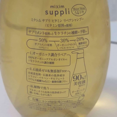 アルガン由来の洗浄成分の効果か、すっきりサラッとなのに潤いもあってまとまりがある理想の洗い上がり! ビタミン原料が入っているだけでなく、90%以上が美容成分で、ノンシリコン。 一度で違いを感じたのでかなり気に入りました。