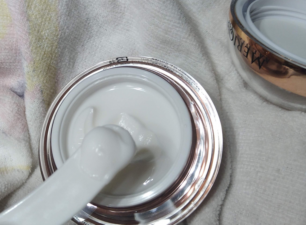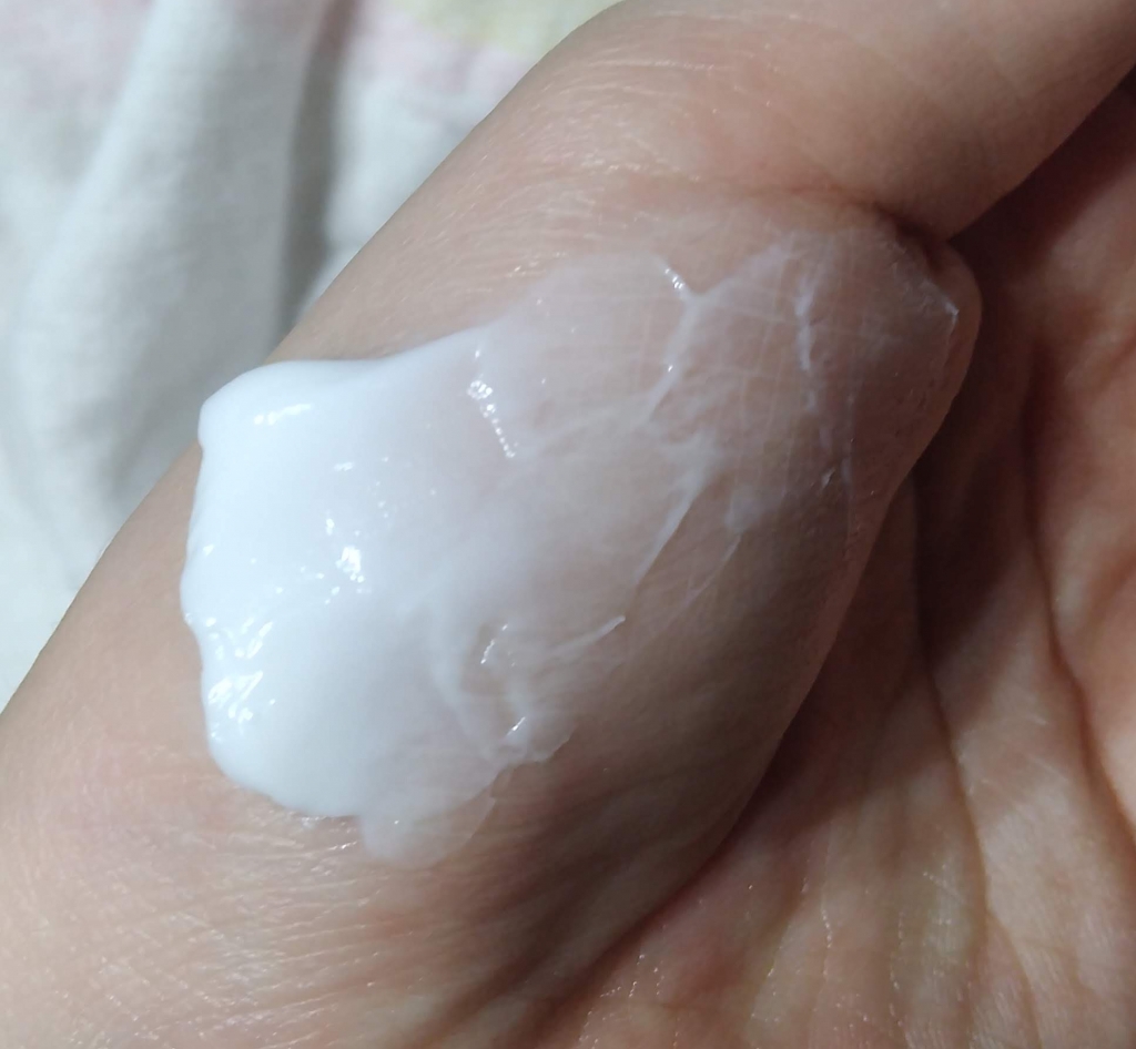 少し固めのこってりしたテクスチャですがみずみずしくよく伸びる。顔に塗るにはこの量は多い笑
